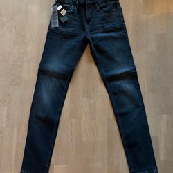 Ett par svarta byxor med raka ben och pressveck. Byxorna har fickor fram och bak. Superflex.