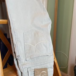 Ett par ljusgrå byxor med fickor fram och bak. Byxorna har en dragkedja och knappstängning.