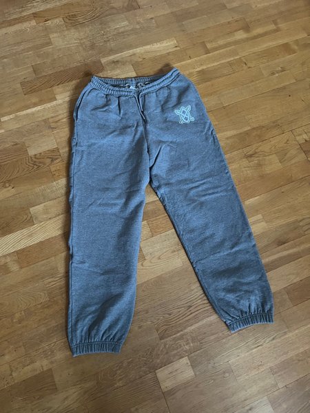 Ett par gråa sweatpants med resår i midjan och bensluten. Byxorna har en dragsko i midjan och en tryckt logotyp på höger lår.
