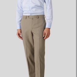 Ett par beiga byxor med fickor fram och bak. Byxorna har en klassisk passform.