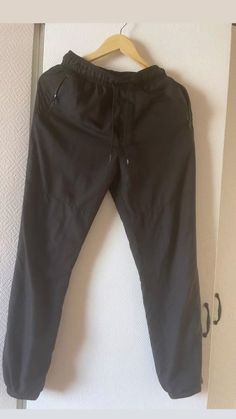 Ett par svarta byxor med resår och dragsko i midjan. Byxorna har fickor med dragkedja.