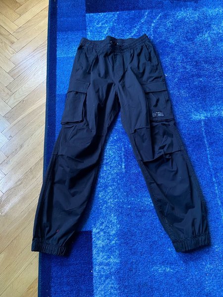 Ett par svarta cargobyxor med resår i midjan och benslut. Byxorna har flera fickor på benen.