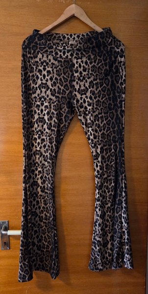 Byxor med leopardmönster. Byxorna har utsvängda ben.