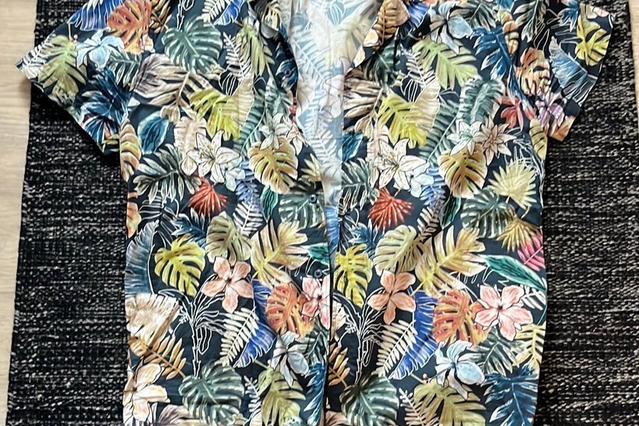 Färgglad kortärmad skjorta med ett mönster av tropiska blad och blommor i olika färger som grönt, gult, blått, orange och rosa. Skjortan har en klassisk krage och knappar fram.