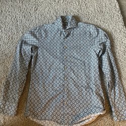 Ljusblå skjorta med ett distinkt mönster i bruna nyanser. Skjortan har långa ärmar och en klassisk krage.