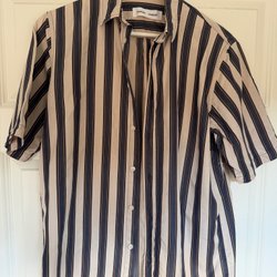 Brun Samsøe Samsøe skjorta med ljusblå ränder. Skjortan har en bröstficka och långa ärmar. Den är i fint skick. Funnits i rök- och djurfritt hem.