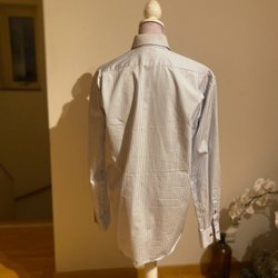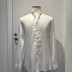 Vit skjorta med tunna, vertikala ränder i blått och rött. Skjortan har långa ärmar som kan rullas upp och fästas med en knapp. Den har en klassisk krage och knäpps framtill med knappar. På vänster bröst finns en liten broderad logotyp.