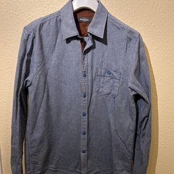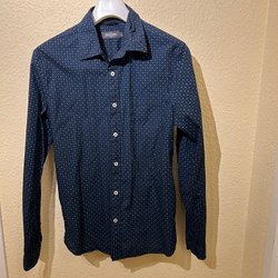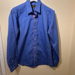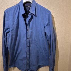 Blå skjorta med långa ärmar och knappar framtill. Skjortan har en detalj med ett annat tyg på insidan av knappslån. Skräddarsydd i Thailand, motsvarar ca storlek M.