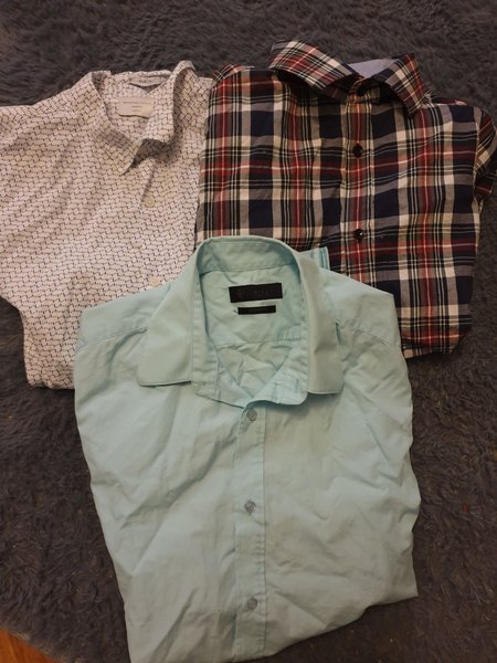 Tre skjortor i olika mönster och färger. En ljusblå, en vit med mönster och en rutig i rött, vitt och blått.