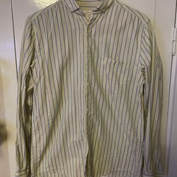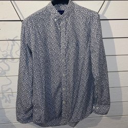 Skjorta med lång ärm och krage. Skjortan har en knappslå framtill med knappar och manschetter vid ärmsluten.
