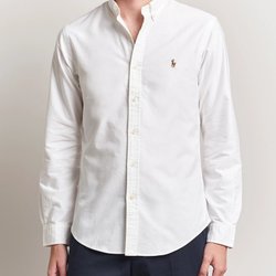 Vit skjorta med långa ärmar och knappar framtill. Skjortan har en klassisk krage och en subtil textur i tyget.