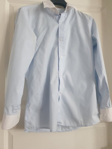 Ljusblå skjorta med vit krage och manschetter. Skjortan har knappar framtill och långa ärmar.