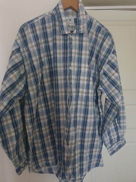 Blå/vit-rutig skjorta med långa ärmar. Skjortan har en bröstficka. Bredd över axlar 55 cm. Längd 78 cm något längre bak. Rundad nederkant. Märke Rocky