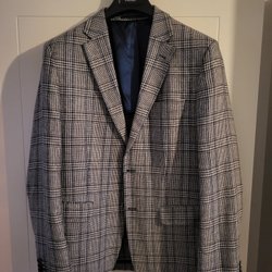Beige kavaj med ett mönstrat foder och en inbyggd matchande bröstnäsduk. Kavajen har två fickor fram och en bröstficka.