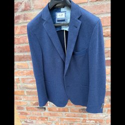 Stilren blå kavaj med vinröd linje och en bröstficka. Storlek 54 men passar dig som vanligtvis har storlek 52. Nypris 5000kr.