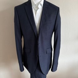 Klassisk kostym i en mörkare nyans. Kavajen har en tvåknäppning och passpoalfickor. Byxorna har en rak passform.