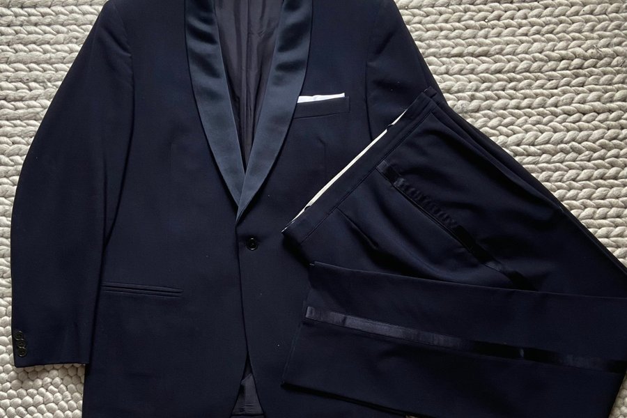 Fin mörkblå smoking. Klassisk passform med hög midja och sjalslag. Färgen är i princip så nära det går att komma svart, mycket stiligt :) Tyvärr ingen märkning eller lappar, men känner ingen skillnad mot mina andra ullkostymer iaf. Småtalet fläckar här och där men är inget jag någonsin stört mig på.