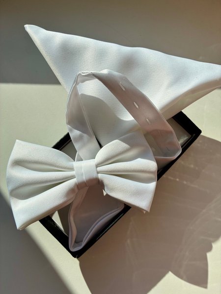 En vit fluga och en matchande näsduk, båda i en elegant och slät design. Flugan har ett justerbart band med knappar för enkel anpassning. Näsduken är vikt och placerad bredvid flugan, vilket skapar en enhetlig uppsättning. Båda delarna är i ett rent och skarpt vitt utförande.