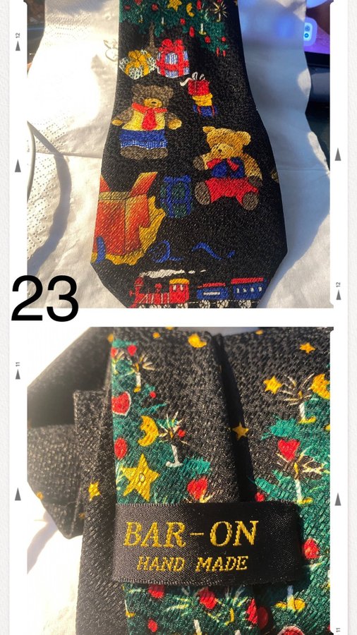 Svart slips med julmotiv. Slipsen har motiv av julgranar, nallar, paket och ett tåg.