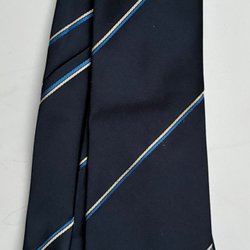 En elegant svart slips med diagonala ränder i vitt och beige. Perfekt för att komplettera en formell eller affärsmässig outfit.
