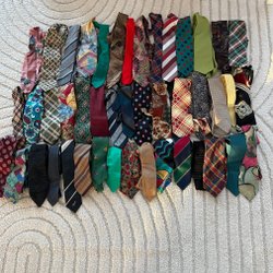 Ett sortiment av slipsar i olika färger och mönster. Här finns randiga, blommiga, rutiga och enfärgade slipsar.