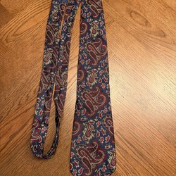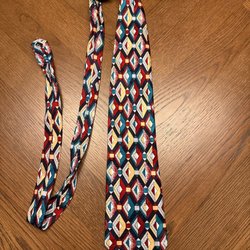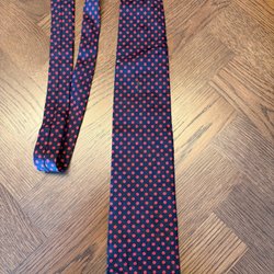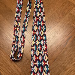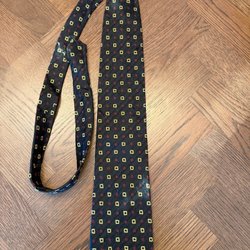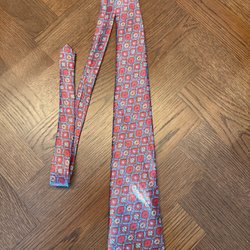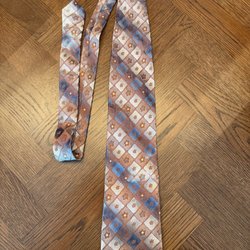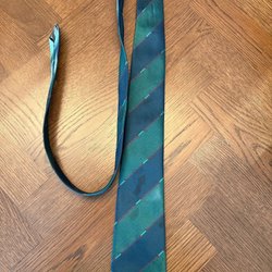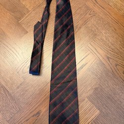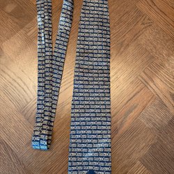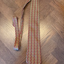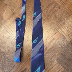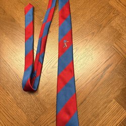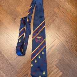 Mörkblå slips med diagonala ränder i gult och rött. Slipsen har även tryckta motiv av lyror och teatermasker. Ett större emblem med ett hus finns också tryckt på slipsen.
