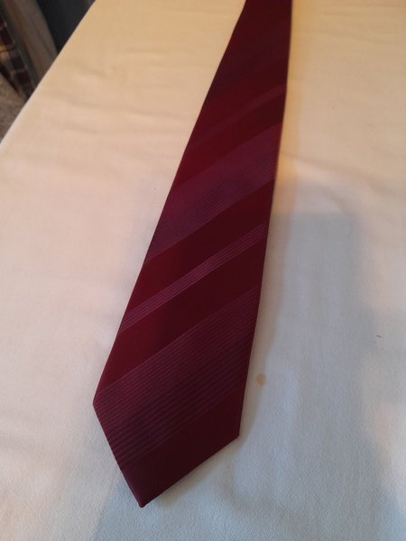 Ett vinrött slips med ett mönster av diagonala ränder i olika nyanser.