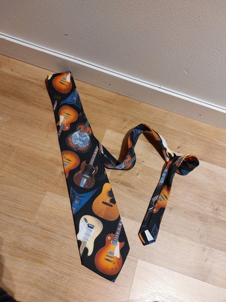 En svart slips med ett mönster av olika gitarrer i orange, brunt, vitt och blått.
