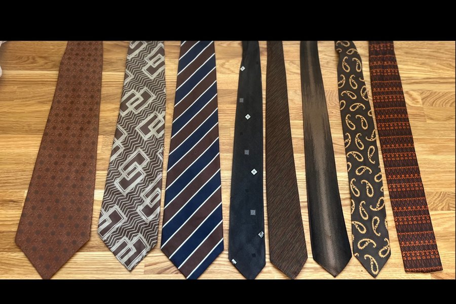 Denna annons inkluderar åtta slipsar med olika mönster och färger. Slipsarna har en blandning av enfärgade, randiga, prickiga och paisleymönster. Färgpaletten består huvudsakligen av olika nyanser av brunt, svart och blått, vilket gör dem mångsidiga för olika tillfällen och klädstilar.