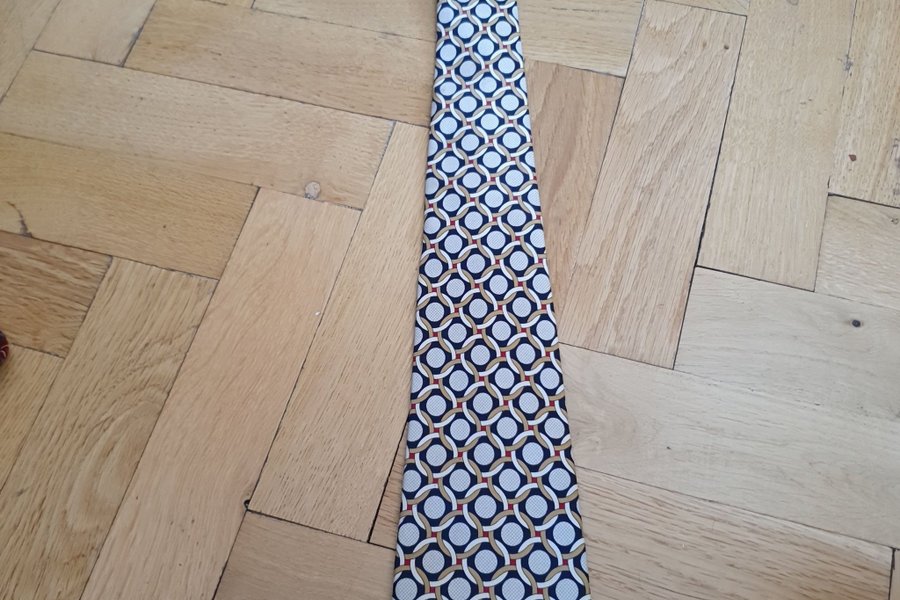 Slips med ett mönster av sammanlänkade cirklar i olika färger. Mönstret består av ljusblå cirklar med vita prickar inuti, omgivna av mörkblå, beiga och röda ringar. Slipsen har en klassisk form.