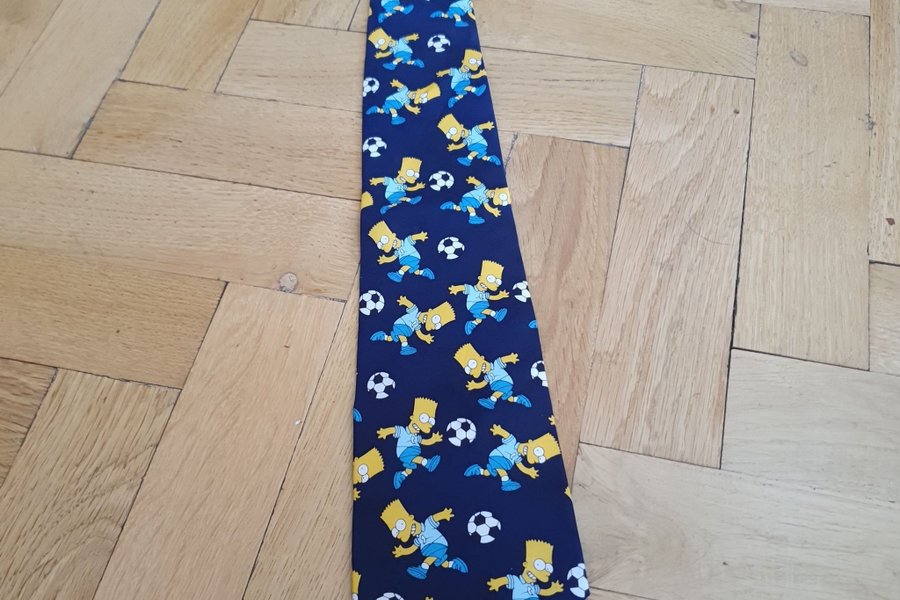 En slips med ett lekfullt mönster av Bart Simpson som spelar fotboll. Slipsen har en mörkblå bottenfärg med gula och ljusblå detaljer. Fotbollarna är vita och svarta. Ett roligt tillbehör för den som vill addera en personlig touch till sin klädsel.