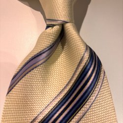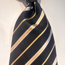 En gul slips med ett mönster av vita droppformade figurer. Slipsen har en spetsig ände och en ögla på baksidan för att hålla den smala änden på plats. Baksidan är mörkblå.
