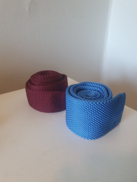Vinröd samt kornblå stickad slips från Trendhim, använda ett fåtal gånger, som nyskick. Bredd 6 cm. Nypris 299 kr/styck: