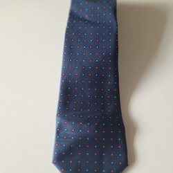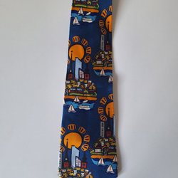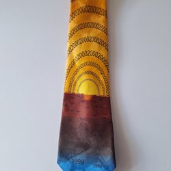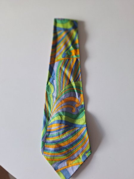 Denna slips har ett livfullt mönster med virvlande former och ränder i olika nyanser av grönt, blått och orange. Mönstret ger slipsen en dynamisk och iögonfallande estetik.