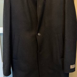 Elegant svart kappa med klassisk krage och knäppning framtill. Kappan har fickor på sidorna och en stilren design.