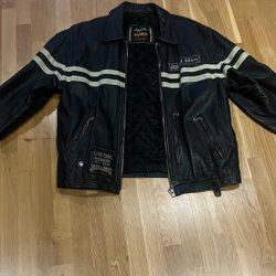 Svart skinnjacka med dragkedja framtill. Jackan har en krage och två fickor framtill. Ärmsluten har en knappdetalj. Baksidan av jackan har sömmar som löper vertikalt och horisontellt över axelpartiet.