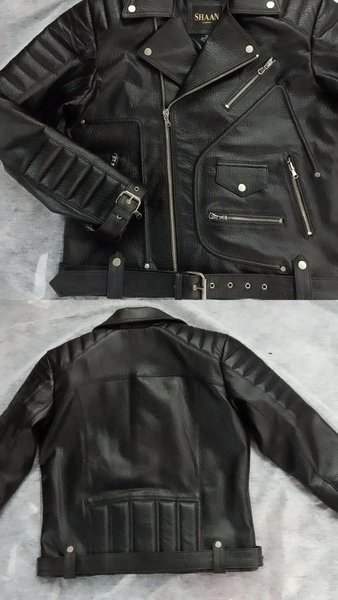 Svart jacka med dragkedja och fickor framtill. Jackan har en bälte i midjan med spänne och tryckknappar. Detaljerad design med sömmar på axlarna och ärmarna.