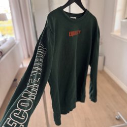 Vändbar Adidas bomberjacka med tryck på både fram- och baksida. Ena sidan är svart med Adidas-logga, den andra är vit med texten ”The world brand with the 3 stripes”.