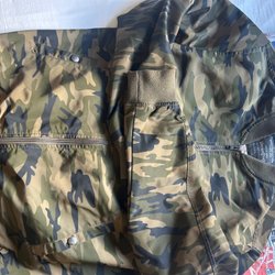 Grön jacka med huva och dragkedja. Jackan har två fickor nedtill och en bröstficka.