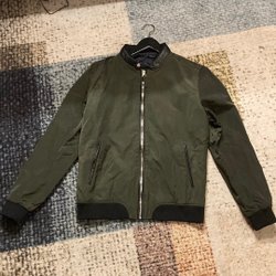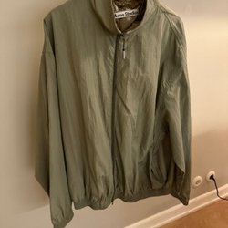 Olivgrön jacka med dragkedja och diamantmönster. Jackan har fickor med dragkedja framtill och en liten detalj på höger ärm. Observera att det finns ett litet hål på vänster ärm.