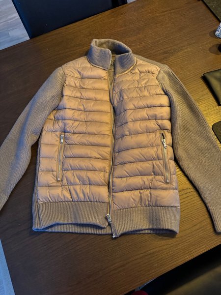 Jacka med stickade ärmar och vadderad fram- och baksida. Jackan har dragkedja fram och två fickor med dragkedja. Riktigt varm och skön med din färg hade gärna haft kvar den men den är lite för stor för mig original pris 1000 någonting oanvänd
