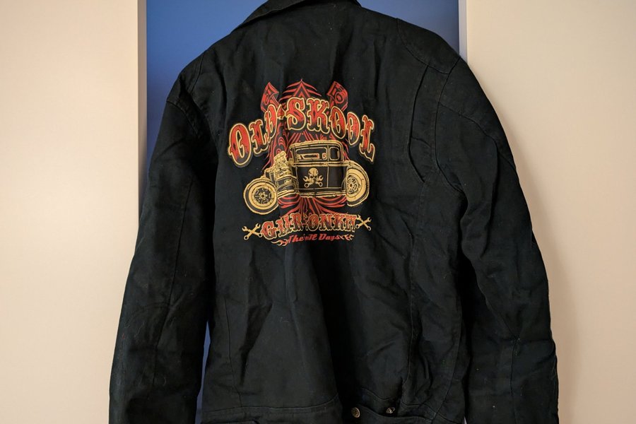 Svart jacka med tryck på ryggen. Trycket föreställer en bil med texten "Old Skool Gitt-R-Onkit The Old Days".