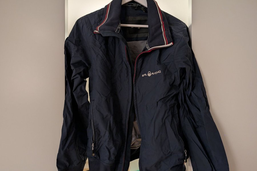 Marinblå jacka från Sail Racing med vit logga på bröstet och detaljer i vitt och rött på krage och muddar.