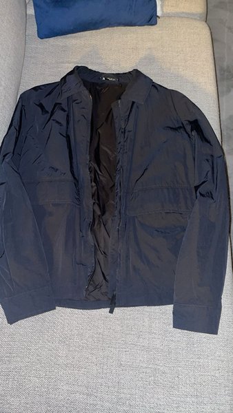 Mörkblå jacka med krage och dragkedja. Jackan har två fickor fram. Två sidfickor och en inne ficka.