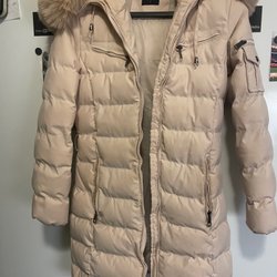 Svart pufferjacka med dragkedja framtill och dragsko nedtill. Jackan har en hög krage.