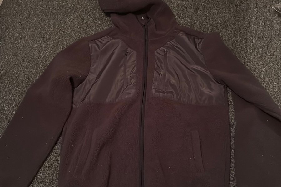Svart fleecejacka med huva och dragkedja. Jackan har två fickor fram och två bröstfickor med dragkedja.