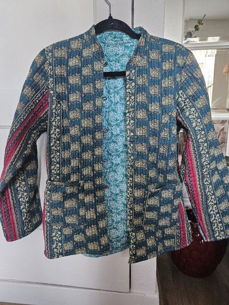 Deze jas heeft een uniek patroon met olifanten en bloemmotieven in blauw, beige en roze tinten. De jas is gewatteerd en heeft een omkeerbaar ontwerp met een lichtere blauwe binnenkant met bloemenprint. De jas heeft een opstaande kraag en knoopsluiting aan de voorkant. Er zijn twee opgestikte zakken aan de voorkant. De mouwen zijn lang en hebben een contrasterende roze streep langs de zijkant.