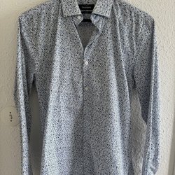 Ljusgrå och vitrandig jacka med dragkedja fram. Jackan har två bröstfickor med lock och två sidfickor. Krage och muddar i samma randiga tyg.
