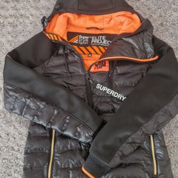 Svart regnjacka med huva och dragkedja. Jackan har två fickor framtill med dragkedja och en innerficka. Den har grå sjönt trikåfoder.