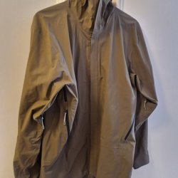 Grön jacka med huva och dragkedja framtill. Jackan har fickor med dragkedja på sidorna och en liten ficka med dragkedja på vänster ärm. Ärmsluten är raka och jackan har en modern design. Något liten i storlek